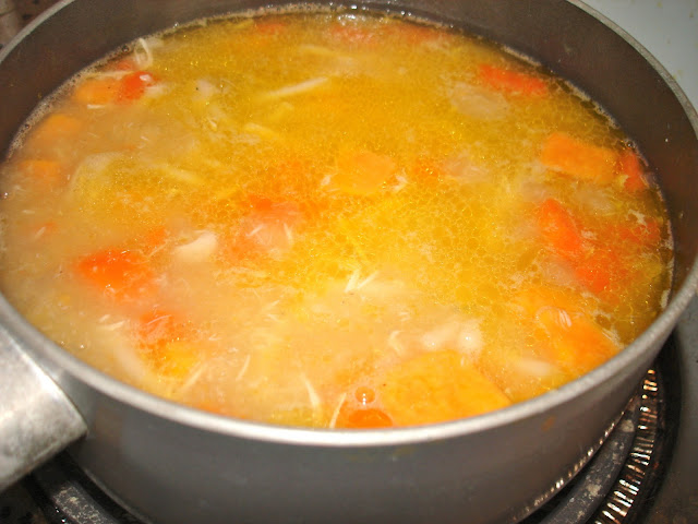 7. Add the sweet potatoes, noodles and chicken meat back into the soup and boil for around 15-20 minutes until the pasta and potatoes are tender.